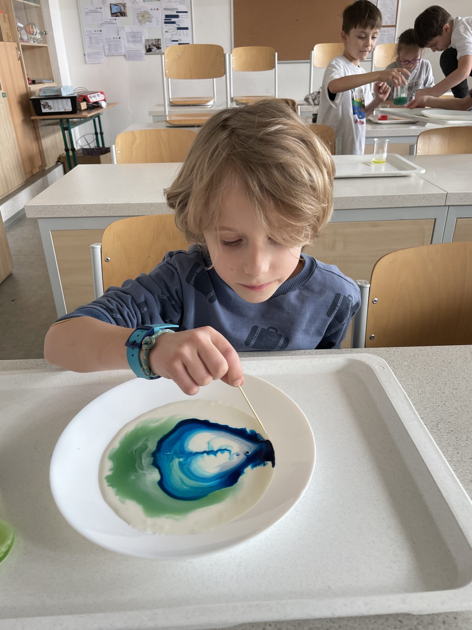 Sam chodí z kroužku naprosto nadšený, experimentování miluje. Už měsíc každý večer svítíme na tác, aby nám fotoluminiscenční prášek v pryskyřici svítil :D.